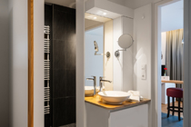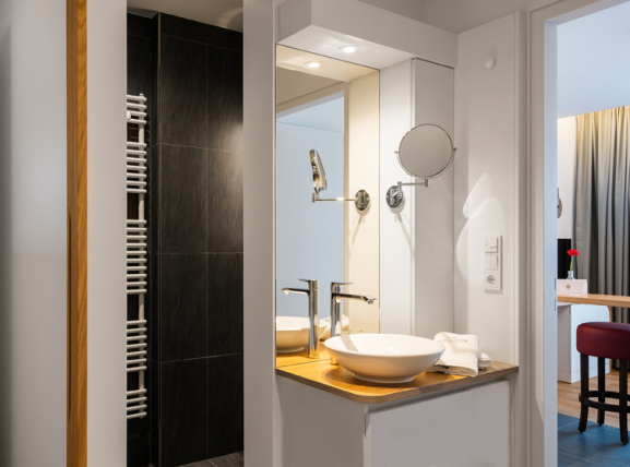 Bad mit Dusche und WC, Sky-TV, Tresor,