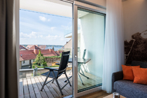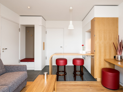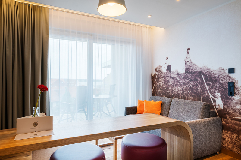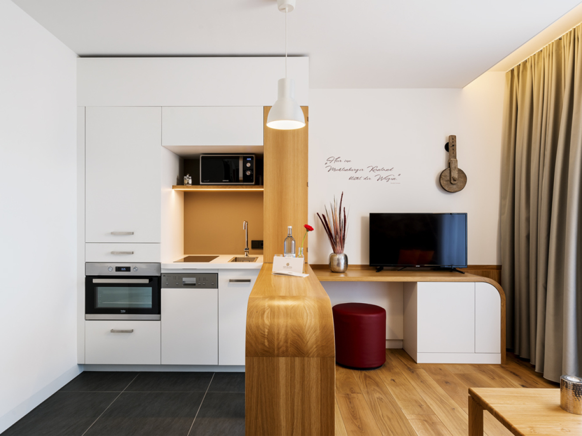 Die Suite "Ackerbürger" befindet sich im Obergeschoss des Hauses und verfügt über einen Schlafbereich und einen kombinierten Wohn-/Essbereich mit offener Küche.