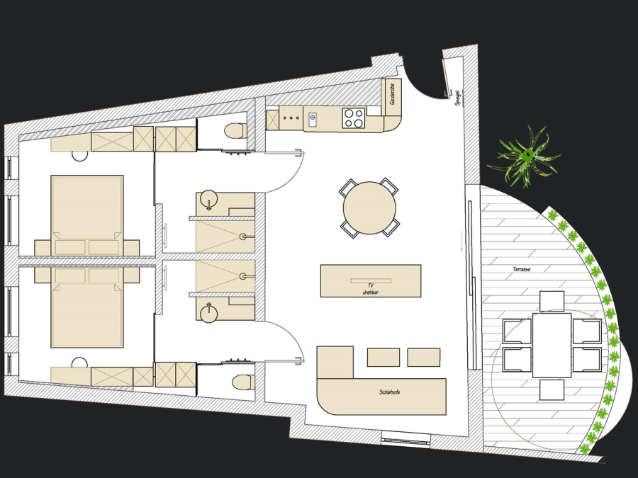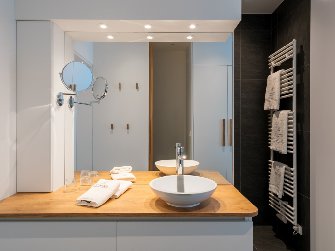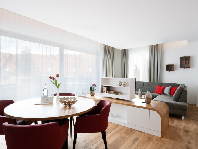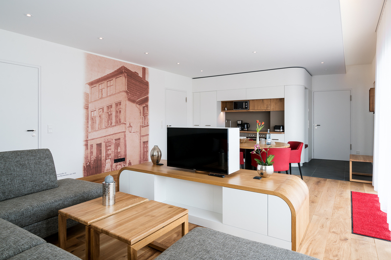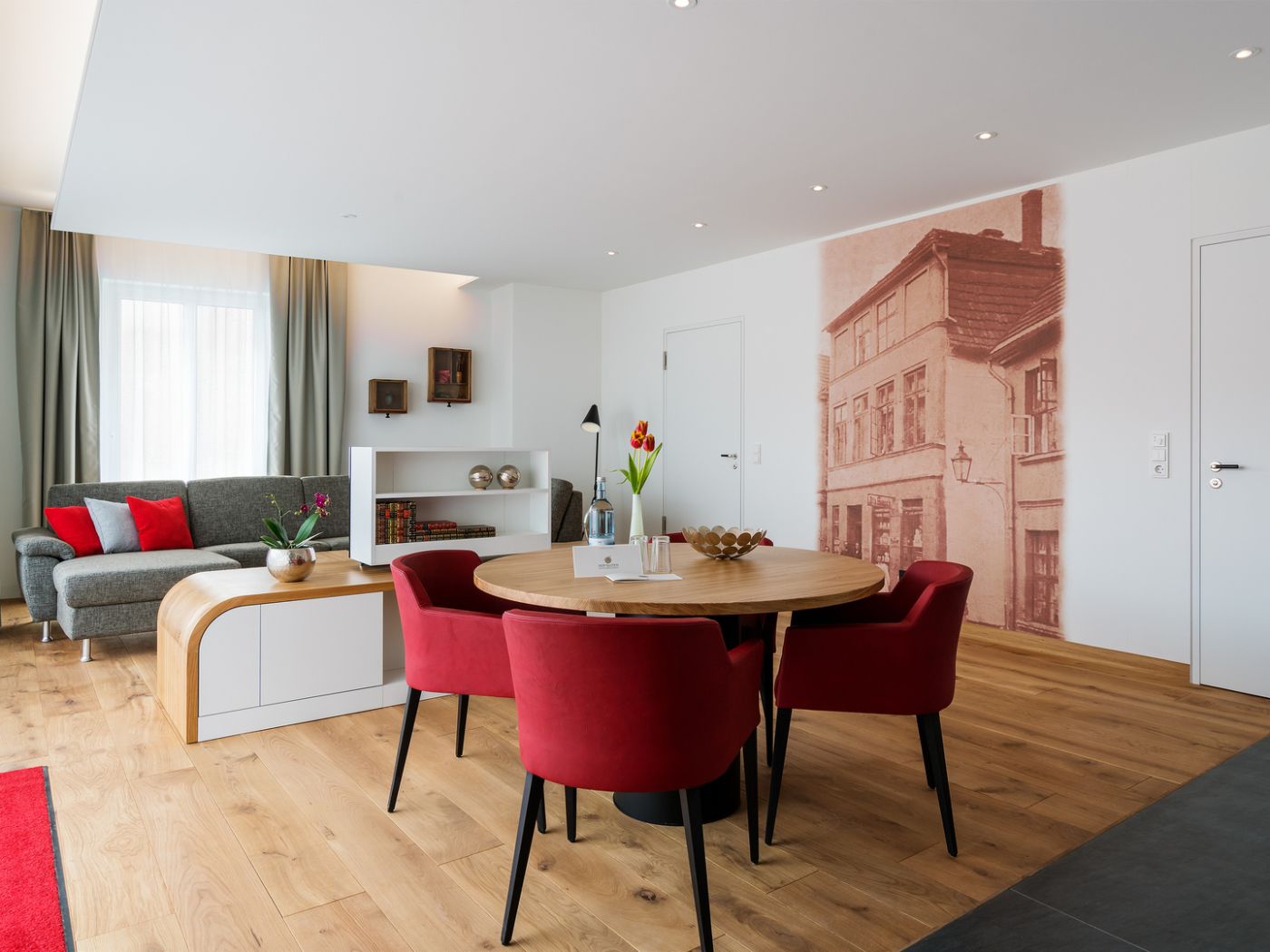Die Suite "Burmeister" befindet sich im Erdgeschoss des Hauses und verfügt über zwei Schlafbereiche mit jeweils einem Bad en suite sowie einen kombinierten Wohn-/Essbereich mit offener Küche.