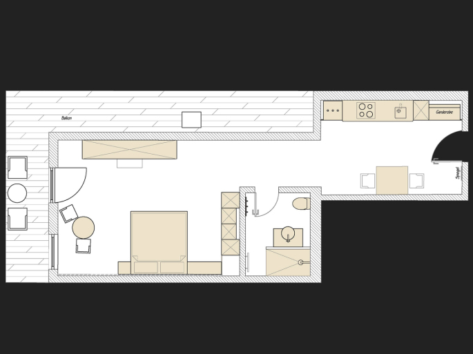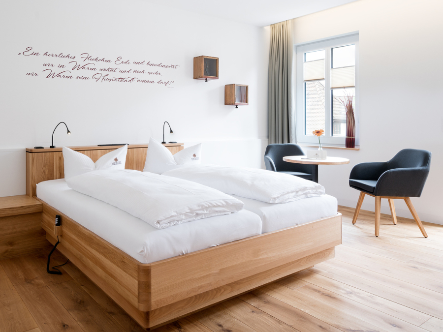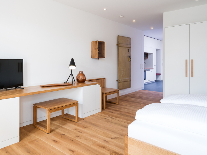 Die Suite "Delikatessen Reggentin" befindet sich im Dachgeschoss des Hauses und verfügt über einen kombinierten Wohn-/Schlaf und Essbereich mit offener Küche.