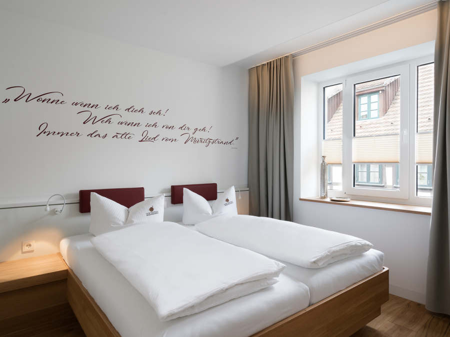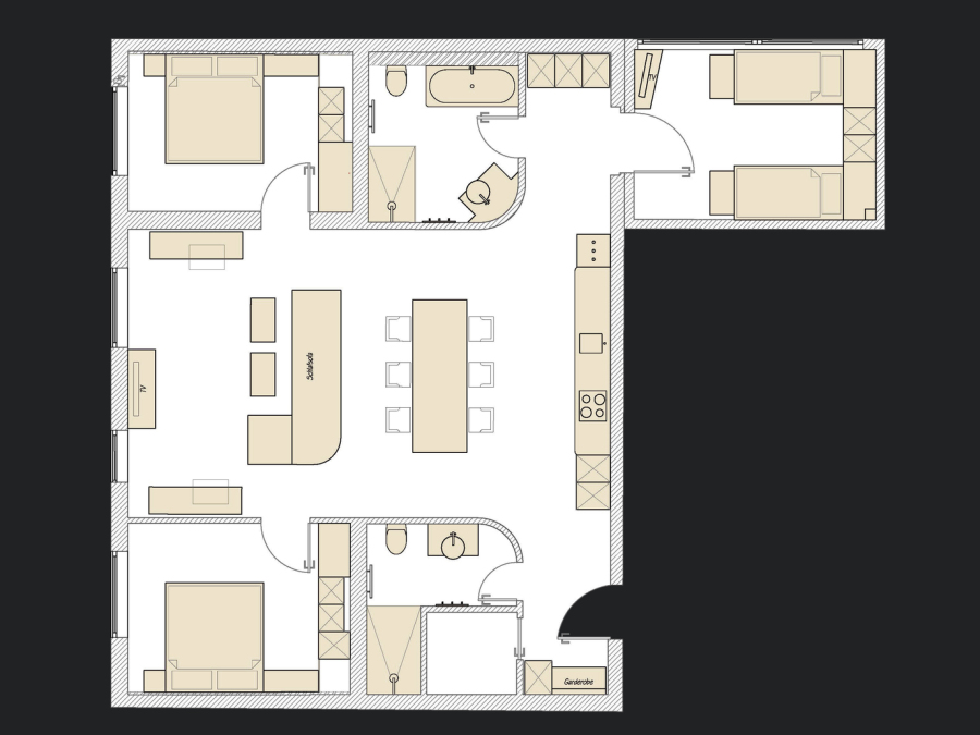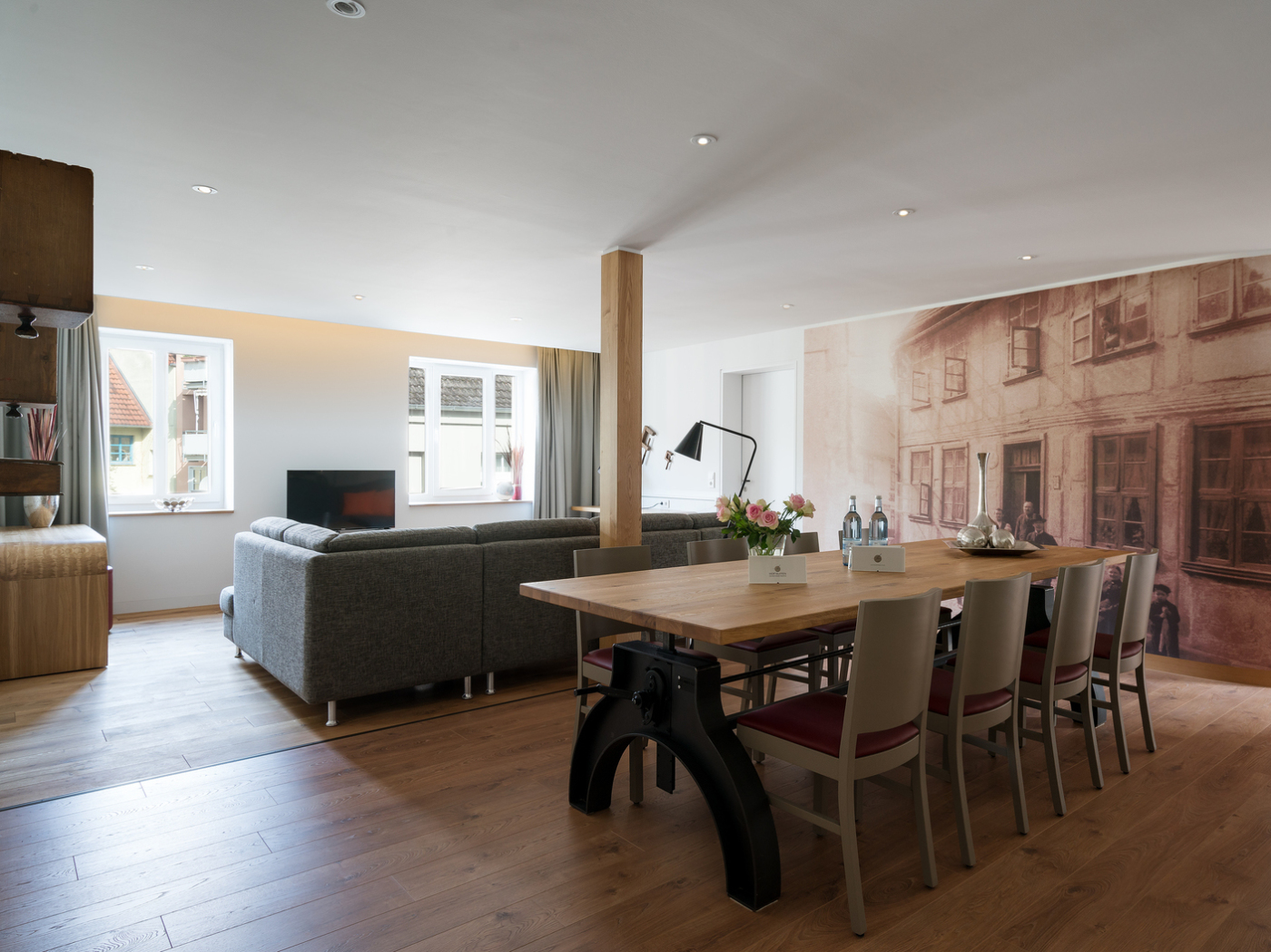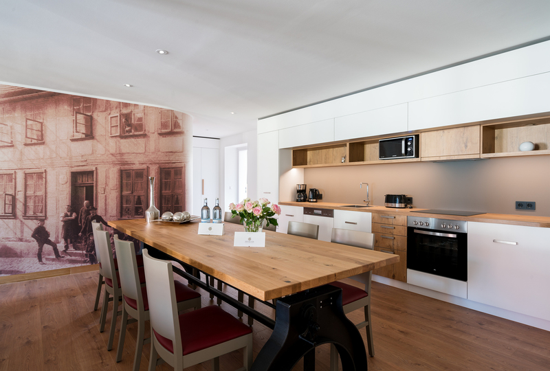 Die Suite "Schuhmacher Rönnberg" befindet sich im Obergeschoss des Hauses und verfügt über drei Schlafbereiche und zwei Bäder sowie einen kombinierten Wohn-/Essbereich mit offener Küche.