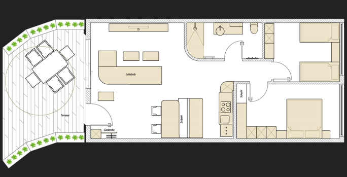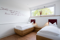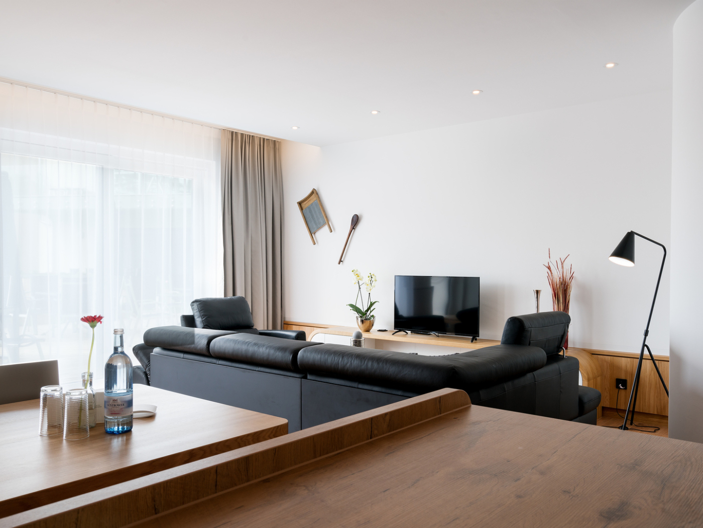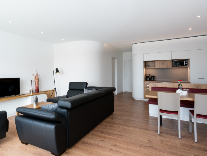 Die Suite "Waschküche" befindet sich im Erdgeschoss des Hauses und verfügt über zwei Schlafbereiche, ein Bad sowie einen kombinierten Wohn-/Essbereich mit offener Küche.