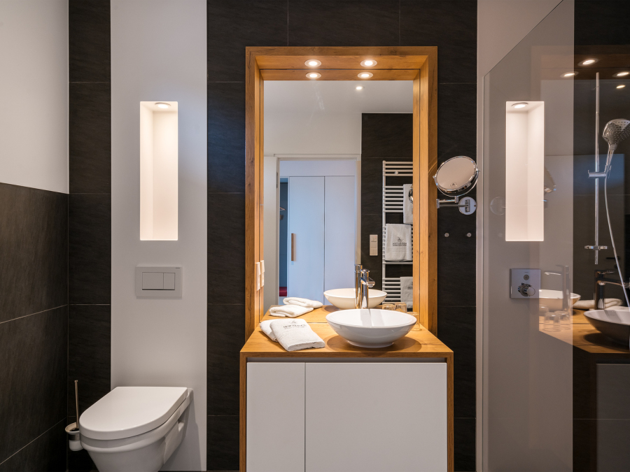 Bad mit Dusche und WC, Sky-TV, Tresor,