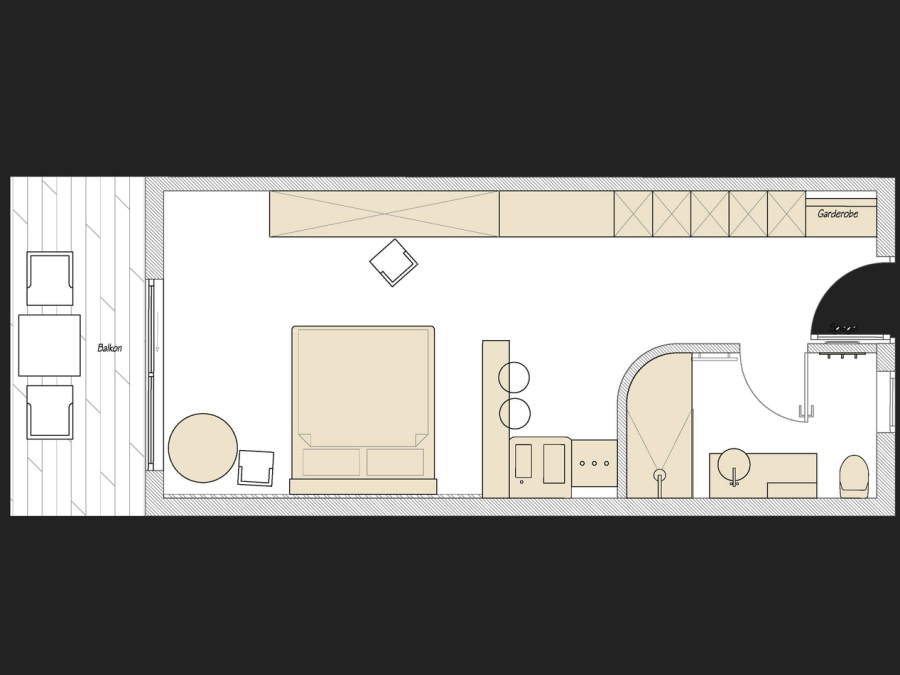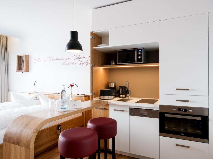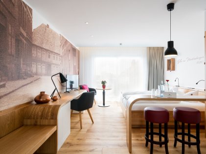 Die Suite "Ziegenmarkt" befindet sich im Obergeschoss des Hauses und verfügt über einen kombinierten Wohn-/Schlaf und Essbereich mit offener Küche.